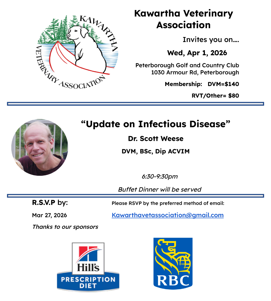 The Kawartha Veterinary Association and its members respectfully acknowledge that the Peterborough Golf and Country Club is located on the Treaty 20 Michi Saagiig territory and in the traditional territory of the Michi Saagiig and Chippewa Nations, collectively known as the Williams Treaties First Nations. We respectfully acknowledge that we are on the treaty traditional territory of the Michi Saagiig. We offer gratitude to the First Nation for their care for, and teachings about, our earth and our relations. May we honour those teachings.